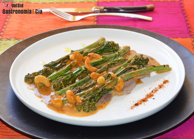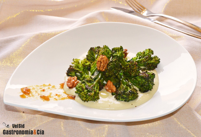 Bimi a la parrilla con salmón ahumado y salsa de mostaza y miel