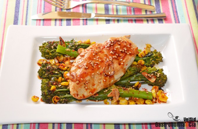 Pechuga de pollo al horno con bimi y aderezo de coco, lima y sriracha