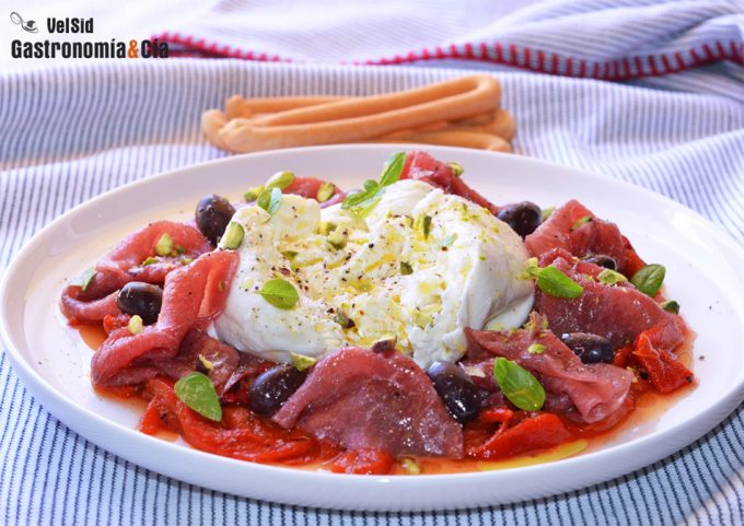 Foto | Ensalada de pimientos asados con burrata, carpaccio de buey y pistachos