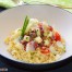 Orzo con espárragos, habitas y jamón: El orzo es una pasta pequeña, similar a los denominados ‘piñones’, la cocinamos con caldo de jamón y espárragos y adquiere mucho sabor, éste se potencia con la guarnición en la que no falta el jamón serrano.