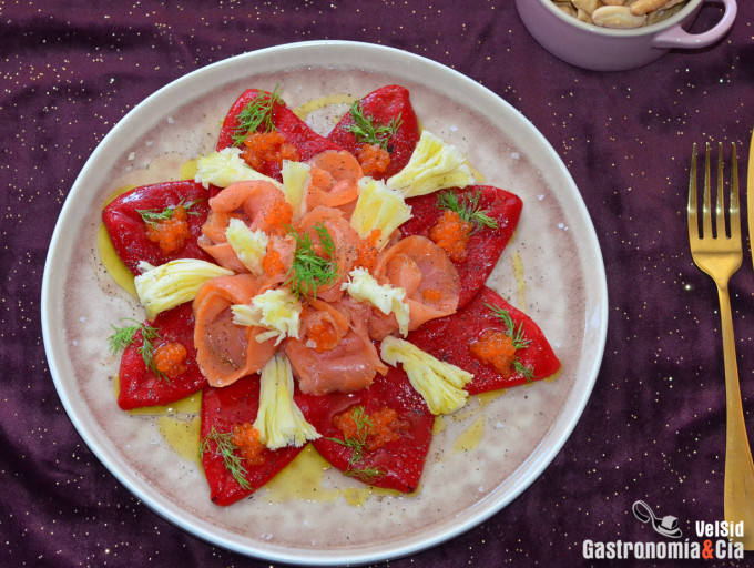 Pimientos del piquillo con salmón ahumado y Tête de Moine