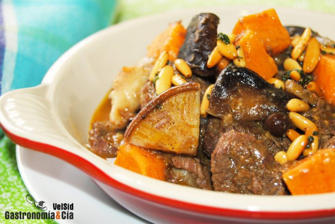 Solomillo de cerdo con puré de boniato y caldo de cebolla tostada