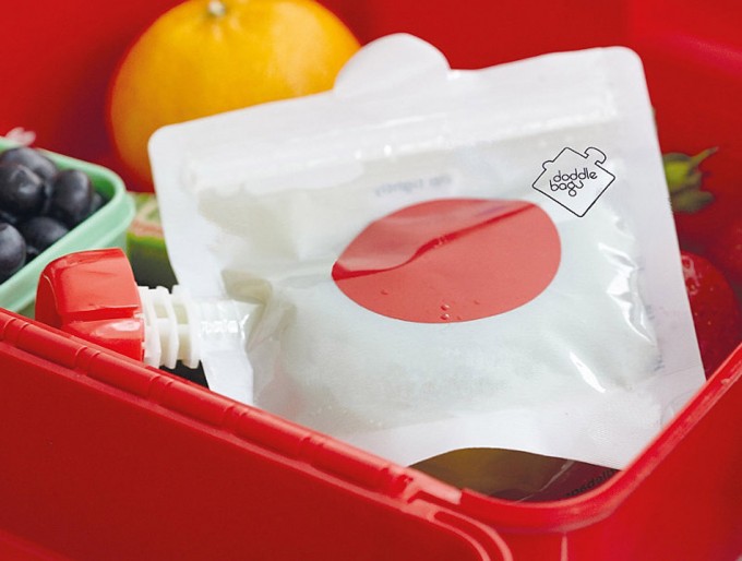 Cuentan que una madre trabajadora, Nadine, se encontró en la situación de necesitar un envase en el que poder poner batidos, yogures, purés y otros alimentos para el almuerzo de su hija pequeña, y diseñó las bolsas con tapón reutilizables que podéis ver en la foto, se llaman DoddleBags, y no sólo son útiles para las preparaciones culinarias o productos antes mencionados, también son una buena opción para poder transportar salsas y aderezos al trabajo, a un picnic o comida al aire libre, etc.