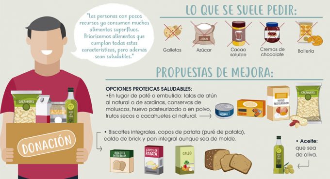 Según Aitor Sánchez, en las iniciativas de recogidas de alimentos casi nunca proponen opciones saludables cuando indican qué alimentos se pueden donar, nosotros hemos visto que hablan de leche, aceite, arroz, harina, legumbres, pasta, conservas… el dietista-nutricionista afirma que también suelen pedir galletas, azúcar, cacao soluble, cremas de cacao y bollería. En cualquier caso, no olvidemos que los supermercados son la principal fuente de comida basura, así que hay que elegir muy bien los productos que se compran en estos centros para que sean nutritivos y saludables, tanto cuando realizamos la compra para nosotros, como cuando la hacemos para donar los alimentos.