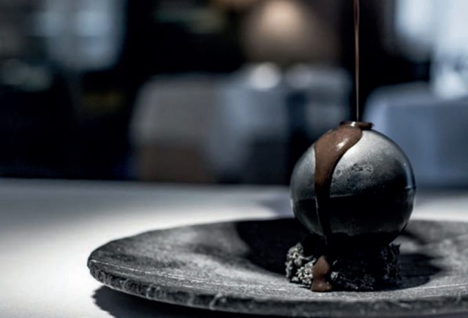 Introducir las dos espumas dentro de la cúpula de chocolate que terminaremos en sala con la salsa de aceituna Hojiblanca.