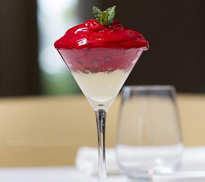 En una copa de cóctel dispón en el fondo la crema inglesa, cubre con un poco de Peta Zetas y con el granizado de cola. Para terminar, dispensa la espuma de frambuesa con el sifón y decora con unas hojitas de hierbabuena fresca.