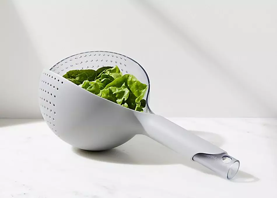 Lo que no nos acaba de convencer es su funcionalidad para escurrir al máximo los alimentos que se lavan en este colador, pues puede hacer el efecto de un centrifugador de lechugas, para ello basta con girar la muñeca mientras sujetamos el colador cerrado con firmeza, pero, ¿no salpicará demasiado?