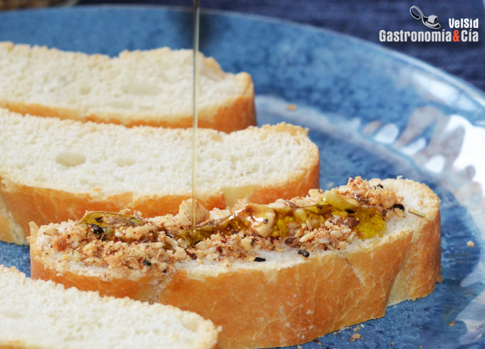 Esta es nuestra dukkah de avellanas y neguilla, y otras tantas especias y semillas que a continuación os indicaremos. Para quien no conozca qué es dukkah, además de invitaros a leer este post, decir que se trata de un condimento o ingrediente de origen egipcio con un uso culinario muy amplio, y que tradicionalmente se sirve sobre una rebanada de pan con aceite de oliva, o se mezcla moja el pan pita en aceite y después en dukkah para que se quede adherido, y es un aperitivo delicioso, exquisito.