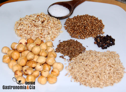 Tostamos por separado todos los ingredientes, excepto la sal, para que desprendan todo su aroma y sabor, pero los dejamos enfriar, dato importante, porque si están calientes cuando los trituremos, el aceite que han liberado las especias y los frutos secos no permitiría que quedara una mezcla suelta.