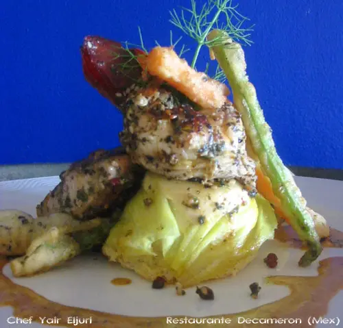 Yair Eljuri, chef ejecutivo del Restaurante Decameron de México comparte una nueva receta en nuestra sección de Recetas de los Chefs, Dúo del mar con mousse de elote y crocante de vegetales. En México se conoce como elote a la mazorca de maíz.