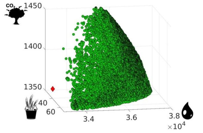 Los resultados de los modelos demuestran que la reorganización de la producción alimentaria por sí sola aumentaría el rendimiento en una media del 83%, la disponibilidad de agua alcanzaría el 8%, y la capacidad de almacenamiento del CO2 en una media del 3%, pero estos incrementos serían mayores si se priorizara a uno de los tres parámetros sobre los otros dos restantes.