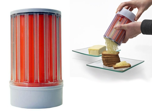Easy Butter es un accesorio de cocina que permite dispensar la mantequilla sin esfuerzo, sin romper las tostadas y en distintas presentaciones. En la imagen podemos ver cómo sale la mantequilla rallada posándose directamente sobre la tostada, de esta manera (sobre todo en estaciones calurosas), no costará nada terminar de extenderla.