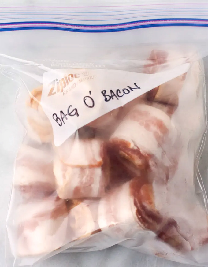 Así, cada vez que queramos añadir bacon a una receta, podremos coger tantas lonchas como deseemos porque estarán separadas, y descongelarlas dejándolas a temperatura ambiente o en el microondas, según necesidades. También se pueden incluir en la receta sin descongelar, de hecho, será más fácil y menos pringoso cortar el bacon cuando esté medio congelado.