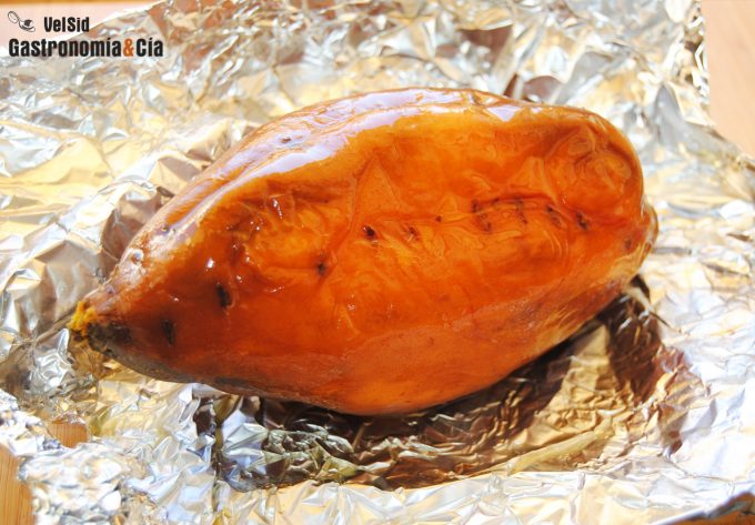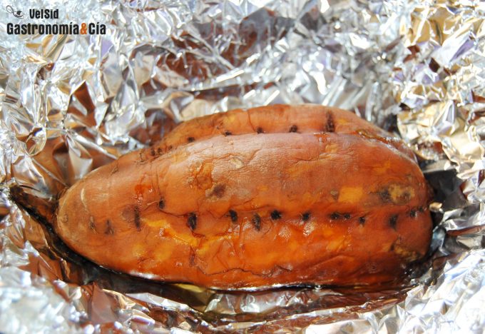 Nuestros recuerdos de infancia con el boniato, sobre cómo lo comíamos, seguro que coinciden con muchos de los vuestros, lo disfrutábamos asado al horno, del mismo modo que lo hacemos hoy, envuelto en papel de aluminio. Y no había nada más que añadir, abríamos el paquete, cortábamos la piel del boniato longitudinalmente e íbamos cogiendo cucharadas de la dulce carne anaranjada de esta raíz. Si eran piezas muy grandes, entonces se cortaban y se repartían en los platos, ya sin piel.