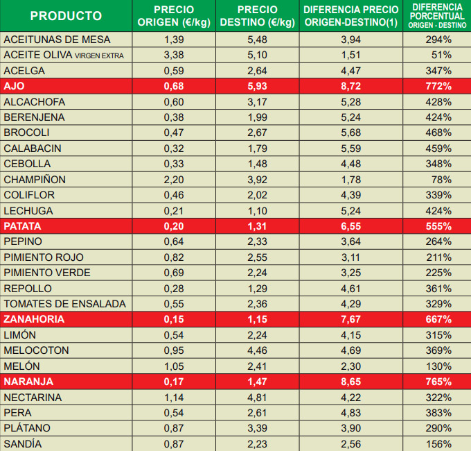 En segundo lugar en este particular ranking de la diferencia de precios, se clasifican las naranjas con una diferencia porcentual origen/destino del 765% (43 décimas más que en abril). En el campo, el precio por kilo de esta fruta se situó en 0’17 euros (un céntimo menos que en abril), y en el mercado, el precio medio también se redujo un céntimo estableciéndose en 1’47 euros. Los datos muestran que en la trayectoria del campo a la mesa, las naranjas multiplicaron su precio por 8’65, y es que los precios oscilan en ambos extremos de la cadena, pero el margen de los intermediarios suele mantenerse y en muy pocas ocasiones podemos ver que sean comedidos.