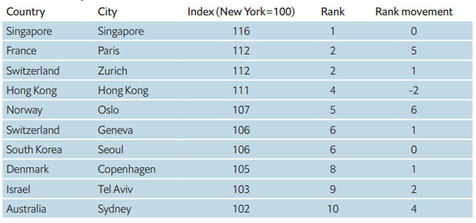 Como se puede comprobar en este ranking de ciudades más caras del mundo, en el que se analizan un total de 133 ciudades, el Top 10 está formado mayoritariamente por ciudades asiáticas y europeas. Los analistas comentan que se han producido varios movimientos en los últimos años, por ejemplo, Tokio era la ciudad más cara del mundo hasta el año 2013, después empezó a sufrir fluctuaciones y en los últimos 12 meses es cuando más ha oscilado en el ranking, desplazándose hasta siete puestos. Seúl ocupaba hace cinco años la posición 21, ahora se clasifica en sexta posición, Tel Aviv ocupaba la posición 34 en 2013, ahora se ha clasificado como la novena ciudad más cara del mundo.