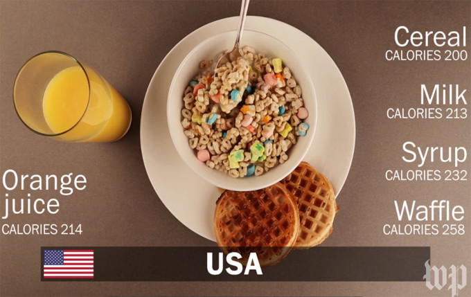 Hoy vemos un vídeo en el que se realiza una comparativa de los desayunos que tradicionalmente se consumen en nueve países del mundo, Reino Unido, Cuba, Etiopía, Japón, Filipinas, Rusia, Países Bajos, Venezuela y Estados Unidos. De todos los países representados, el desayuno más calórico es el de Estados Unidos, está formado por un bol de cereales, leche, un par de gofres, sirope y un vaso de zumo de naranja comercial. Todo esto aporta nada menos que 1.073 calorías, y no es de extrañar, ya que este desayuno cargado de alimentos procesados contiene nada menos que 80 gramos de azúcares añadidos.