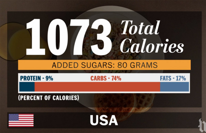 En Venezuela el desayuno tradicional está formado por unas arepas, un revuelto de huevos, cebolla picada y tomates salteados y queso. El plato aporta 775 calorías con un contenido del 5% en carbohidratos, un 68% de grasas y un 27% de proteínas. De todos los desayunos representados en el vídeo publicado en este artículo de The Washington Post, el menos saludable es el desayuno estadounidense por su elevado contenido en azúcar, recordemos que la OMS recomienda no superar los 25 gramos de azúcar (seis cucharaditas de café) al día, recomendación que se realiza para un adulto con un IMC normal.