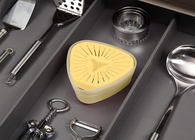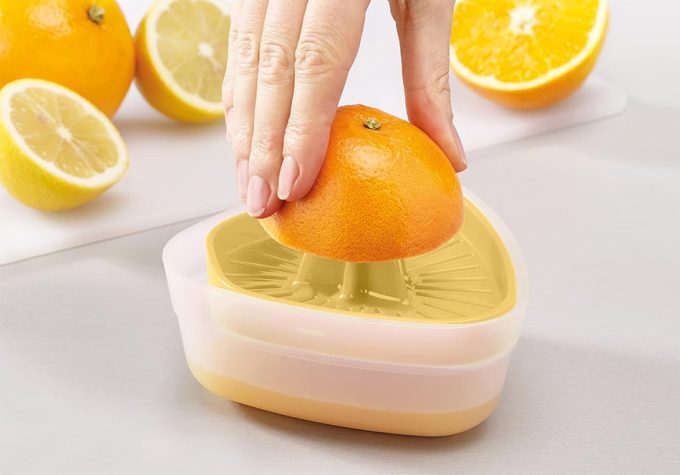 Pero tiene una forma tan particularmente engorrosa para guardarlo… bueno, no es difícil, pero ocupa más espacio del que nos gustaría. Por eso nos ha encantado el nuevo exprimidor manual compacto que ha diseñado Morph para Joseph Joseph, porque sigue siendo un utensilio sencillo, práctico y útil, y además es fácil de guardar, mirad las fotos.