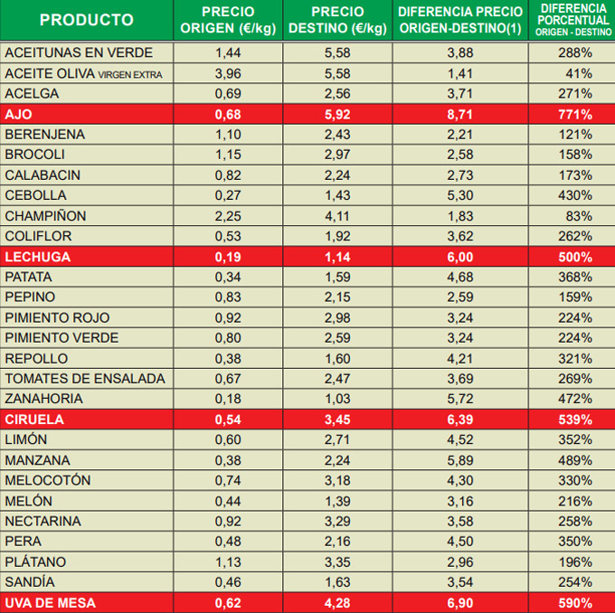 Después de los ajos, es la uva de mesa el producto que aparece con una mayor diferencia porcentual (590%), en origen, el kilo de uva se cotizó a una media de 0’62 euros, y en el mercado, el precio medio por kilo pagado por los consumidores fue de 4’28 euros, lo que indica que en el trayecto del campo a la mesa las uvas multiplicaron el precio 6’90 veces. A pesar de los mayores costes de producción y otros problemas de sector, los intermediarios no son comedidos y mantienen sus márgenes de beneficios, siendo siempre los perjudicados los extremos de la cadena, agricultores y consumidores.