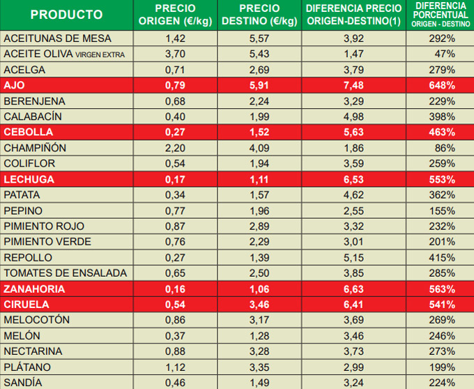 A pesar de que en un principio podría parecer un buen dato, nada más lejos de la realidad, ya que en algunos casos las diferencias son muy significativas y se pueden considerar especulativas. Lo más relevante del indicador que presenta COAG es el precio de los ajos, el IPOD destaca que hemos pagado casi ocho veces el precio de los ajos en el campo, por lo que la diferencia porcentual origen/destino se situó en un 648%. En origen, el kilo de ajos se cotizó a una media de 0’79 euros, mientras que en el mercado el precio medio fue de 5’91 euros/kilo, es decir, hemos pagado 7’48 veces el precio que ha recibido el agricultor.