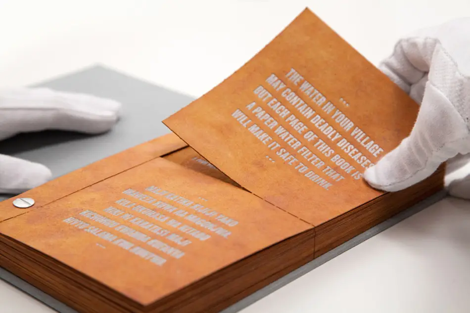 Un grupo de investigadores de la Universidad de Carnegie Mellon y de la Universidad de Virginia (ambas de Estados Unidos), en colaboración con el especialista en tipografía Brian Gartside, ha desarrollado para la organización sin ánimo de lucro WATERisLIFE el denominado ‘Libro Potable’, una herramienta cuya finalidad es facilitar a los países en vías de desarrollo el acceso al agua potable, a la vez que proporciona consejos sobre el uso adecuado del agua y advertencias sobre los riesgos que se corren al beber agua contaminada.