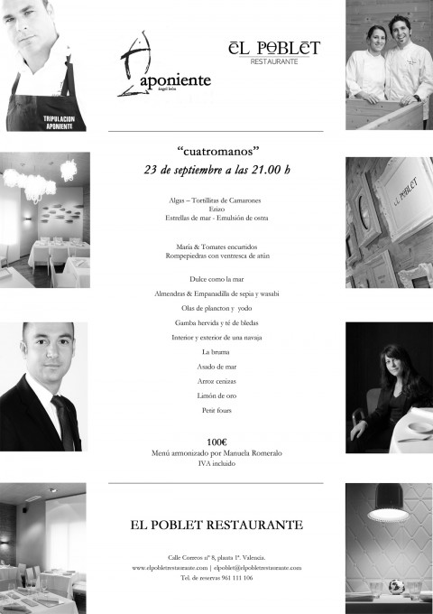 Germán Carrizo nos cuenta que una vez inaugurada la nueva iniciativa de El Poblet, el ‘Cuatro Manos’, se irá celebrando cada dos meses aproximadamente, contando con la participación de otros grandes cocineros, tanto locales como nacionales. Os lo queremos adelantar porque cada vez que se vaya a realizar un Cuatromanos en El Poblet, lo anunciará Quique Dacosta y su equipo a través de Twitter y de su blog.