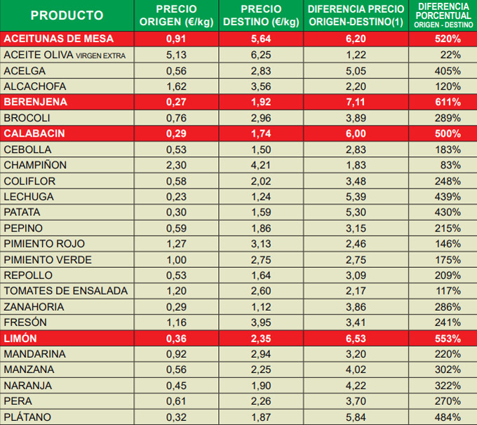 Los limones se clasifican en segundo lugar en este ranking de las diferencias de precio especulativas, con una diferencia porcentual origen/destino del 553. En el campo, el kilo de limones se cotizó a una media de 0’36 euros por kilo, lo que supone un incremento de tres céntimos sobre el precio en marzo. Claro, que esta subida se ha repercudido en el mercado, ya que los consumidores hemos pagado 2’35 euros por kilo de esta fruta, y el céntimo que falta ha pasado a aumentar un poco más el margen de beneficio de los intermediarios.