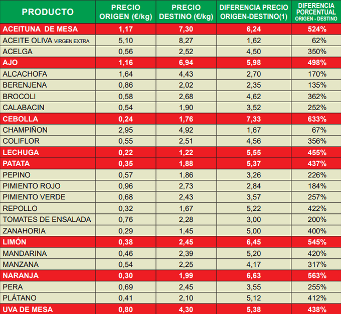 El kilo de cebollas en origen (el campo) se cotizó a una media de 0’24 euros (un céntimo más que en octubre) y en el mercado el precio medio por kilo se estableció en 1’76 euros, lo que supone una subida de tres céntimos respecto al mes de octubre. Es decir, la insignificante mejora del precio en el campo se ha trasladado a los consumidores, pero multiplicada por tres. Estos datos indican que en el trayecto del campo a la mesa, las cebollas multiplicaron por 7’33 veces su valor en origen.