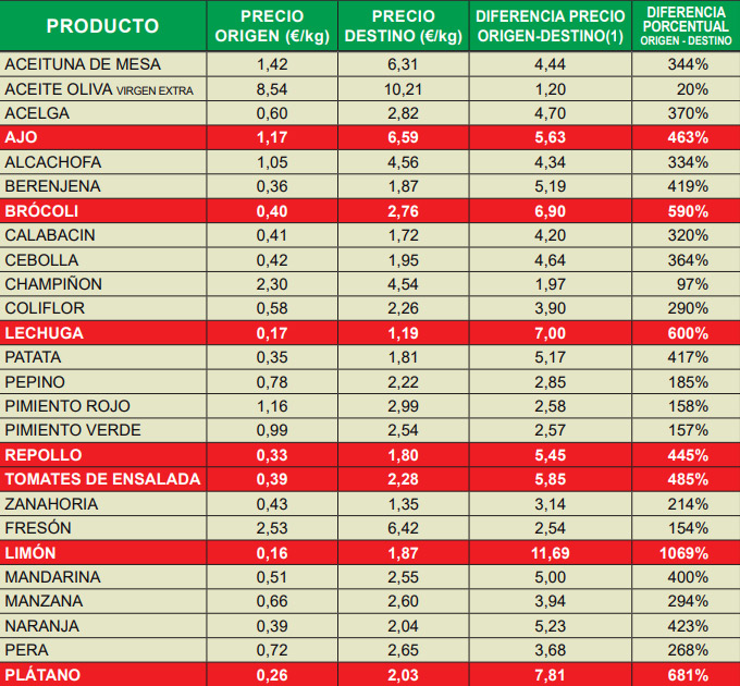 En tercer lugar se clasifican las lechugas en este “ranking de las diferencias de precio especulativas”, con una diferencia porcentual origen/destino del 600%. En el campo, el kilo de lechugas se cotizó a una media de 0’17 euros, mientras que en el mercado el precio medio se estableció en 1’19 euros, esto quiere decir que los consumidores hemos pagado siete veces el valor de las lechugas en el campo, un sobrecoste que indignará a agricultores y consumidores.