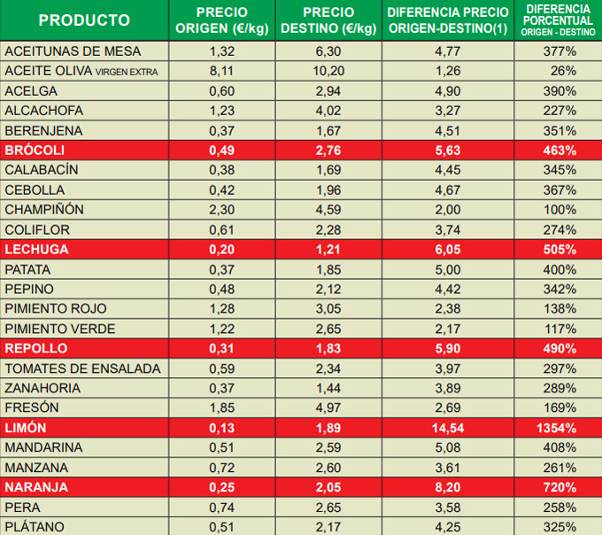 En tercera posición se clasifican las lechugas, cuya diferencia porcentual origen/destino es del 505%, reduciéndose en 95 décimas respecto al mes de febrero. En origen, el kilo de lechugas se cotizó a una media de 0’20 euros, lo que supone un incremento de tres céntimos respecto al mes anterior, mientras que en el mercado el precio medio se estableció en 1’21 euros, es decir, la subida en el campo se ha trasladado al consumidor y, además, aumenta el margen de los intermediarios. Los datos muestran que en el mercado hemos pagado unas seis veces el valor de las lechugas en el campo.