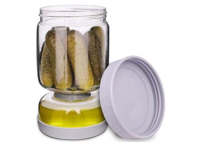 Y es que este tarro para encurtidos escurre el líquido dándole la vuelta, dispone de un colador que permite que el líquido cambie de habitáculo, pasando a la parte inferior, y dejan los sólidos escurridos en la parte superior, estando listos para poder cogerlos con las manos sin tener que mojarse los dedos.