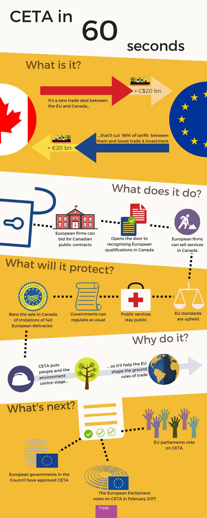 El Acuerdo Integral de Economía y Comercio (CETA) entre Europa y Canadá eliminará prácticamente todos los aranceles comerciales que actualmente existen, hay que tener en cuenta que el volumen de transacciones entre ambos bloques se calcula actualmente en unos 60.000 millones de euros, cifra que se espera que se incremente en un 20% tras la entrada en vigor del acuerdo. Los responsables del INTA consideran que se trata de un gran paso con muchos beneficios para ambos bandos, algo que no comparten diferentes organizaciones europeas y canadienses.