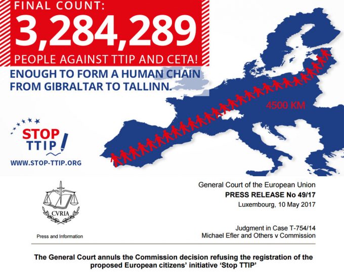 El caso es que se recogieron más de tres millones de firmas que respaldaban Iniciativa Ciudadana Europea (ICE), entre octubre de 2014 y octubre de 2015. Se consiguieron recabar votos de 23 países, aunque la legislación comunitaria indica que basta con que se alcance el mínimo número de votos en siete países. Se había solicitado a la Comisión Europea el registro de esta iniciativa, pero la VE la rechazó con el pretexto de que los mandatos de negociación sobre el TTIP y el CETA no eran todavía actos jurídicos, además, no se podían hacer propuestas de ratificación negativas, por lo que no se aceptaba la solicitud de la ICE.