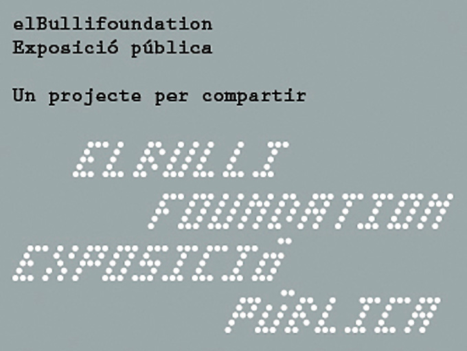 La exposición pública ‘elBullifoundation. Un proyecto para compartir’ (al parecer, denominada así porque Ferran Adrià y Juli Soler hacen depositaria a la ciudadanía de Cataluña de elBullifoundation, haciendo donación a la Generalitat de Cataluña de los espacios de Cala Montjoi de Roses) se ubica en la segunda planta del Palau Robert y se podrá visitar hasta el próximo 27 de julio de 2014.