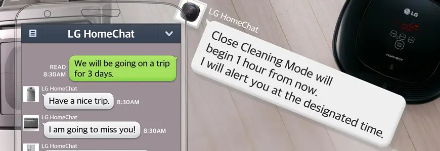 Si hablamos del horno, se va a poder «chatear» con este aparato y los usuarios recibirán recomendaciones de recetas de cocina, lista de ingredientes necesarios y realizar los oportunos ajustes programando el modo de cocción, el tiempo, la temperatura, bastará con abrir el horno e introducir los alimentos a cocinar, evitando así tener que configurar manualmente la cocción. Todos los electrodomésticos se podrán controlar y monitorizar desde la aplicación LG HomeChat, la comunicación será mediante lenguaje natural, es decir, sin comandos específicos u órdenes concretas. También se han dispuesto herramientas de diagnóstico para solventar problemas menores en los electrodomésticos evitando tener que recibir la asistencia de un técnico especializado.