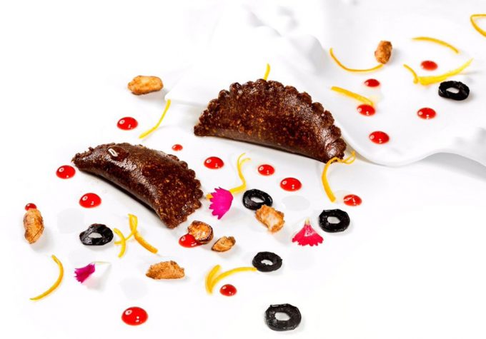 Cómo nos gusta terminar una comida especial con un postre de chocolate… tanto en casa como en un restaurante, y aunque hubo un tiempo en el que parecía que muchos se decantaban más por postres con otros ingredientes y sabores, a menudo cítricos y refrescantes, parece que el chocolate ha vuelto a las propuestas dulces de las grandes casas. No es el caso de estas Empanadillas de miel de caña y almendras rellenas de crema de cacao de Arzak, puesto que no es un postre que actualmente se sirva en este triestrellado restaurante de San Sebastián, pero seguro que ofrecen alguna otra delicias chocolateada.