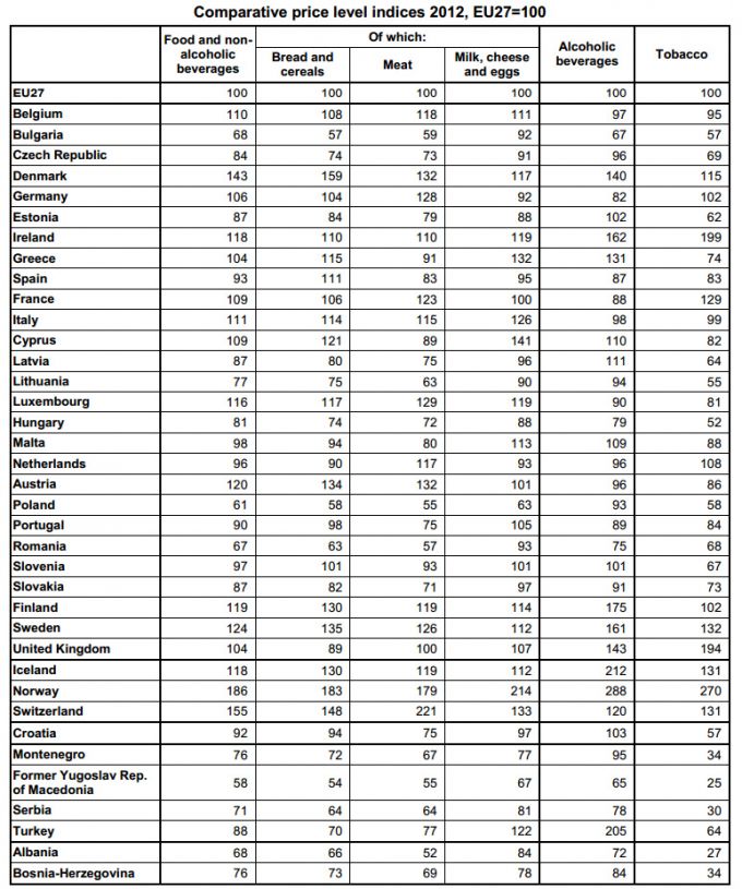 Son pocos los productos detallados en estas estadísticas sobre las significativas diferencias en los niveles de precios de los alimentos, bebidas y tabaco en Europa en 2012, los alimentos clasificados en tres grupos: pan y cereales, carne, y leche, queso y huevos. Además de lo mencionado, bebidas alcohólicas y tabaco.