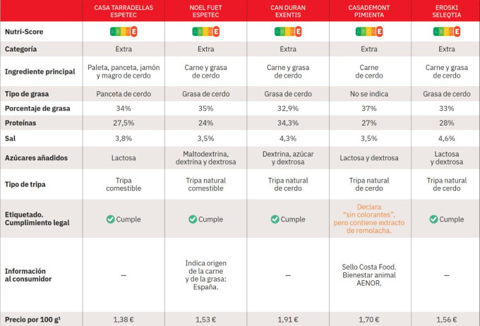 Los diez fuets que ha analizado Consumer son: Casa Tarradellas Espetec, Noel Fuet Espetec, Can Duran Exentis, Casademont Pimienta, Eroski Seleqtia, Loza, El Pozo Fuetec, Navidul La Fuetería, Campofrío Pavofrío y El Pozo Nobleza. Todos estos fuets son de categoría Extra, salvo el último que es normal.