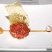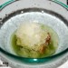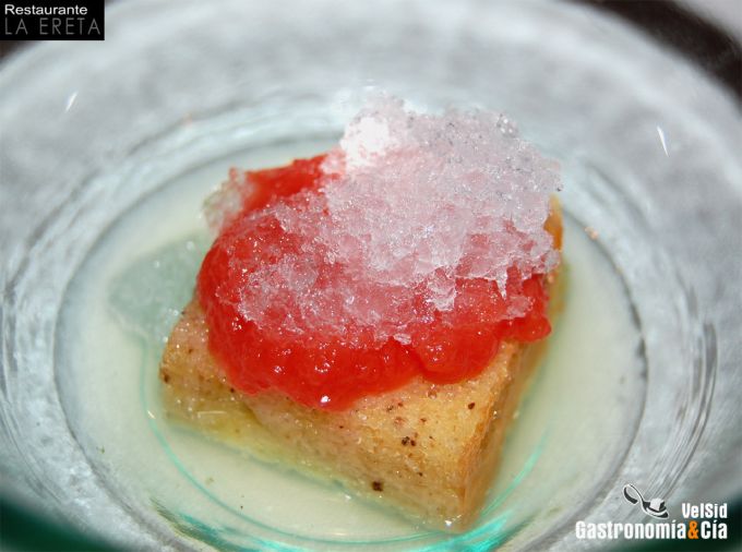 Si leísteis el post Daniel Frías en Madrid Fusión, reconoceréis el siguiente plato, el Tartar de gamba roja, perlas de soja y lima y cabeza. Dani nos contaba que la mejor forma de degustar una gamba es empezando por el cuerpo y después disfrutando de la intensidad en sabor que ofrece el jugo de su cabeza, con esta idea nos presenta el plato con el tartar, exquisitamente acompañado con las perlas con suave sabor a soja, equilibrado toque cítrico y junto a él, un tubo que contiene el jugo de la cabeza de la gamba. Una vez experimentada esta forma de degustación de la gamba, sobra decir que es muy acertad, una exquisitez.