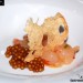 Con lo que nos gustan los arroces… el Arroz ‘amb ceba’, bonito y crestas de gallo fue uno de los mejores platos. El arroz muy sabroso, hecho con muy buen caldo, sin duda, y con su interior aún ligeramente crujiente. El bonito como veis bien tostado, incluso crujiente en su superficie y conservando una carne jugosa y fresca. La cresta de gallo nos resulta difícil de definir porque no es algo que hayamos comido a menudo, es cuestión de asimilar texturas, pero su sabor no nos defraudó.