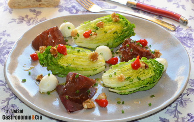 Para quienes dejan de comer ensaladas frescas en los meses fríos, llega el cambio de hábitos, pues empiezan los días cálidos de esta primavera (aunque en algunas regiones tenemos días más que calurosos intercalados con los habituales en esta estación) y con ello, apetecen las comidas más refrescantes y ligeras, pero no menos nutritivas. Cumpliendo estas reglas os proponemos elaborar esta Ensalada de cogollos, cecina y nueces, rica, sencilla, vistosa, saludable…