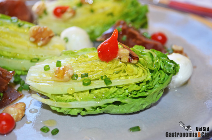 Podríamos seguir relatando virtudes, pero lo mejor es ir al grano y contaros qué lleva esta ensalada de cogollos, al menos tomad la idea y después adaptadla a vuestro gusto o a vuestra despensa si es necesario. La cecina os recomendamos que la compréis a granel y que os la corten bien fina, las nueces que sean nacionales, los pimientos lágrima son originales y están ricos, pero si no los encontráis, podéis poner unas tiras de pimientos del piquillo. El aceite de nueces nosotros lo hacemos en casa con Olix, pero también lo podéis encontrar en tiendas gourmet. Y poco más que añadir, probad esta rica ensalada con cecina y nueces y disfrutad.