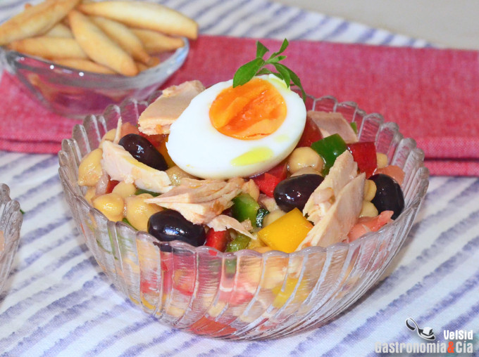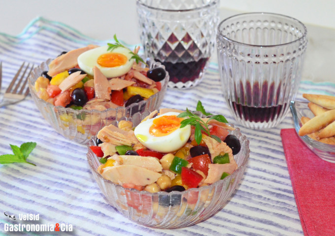 Se conoce como ‘empedrat’ a un plato tradicional de la cocina catalana que se elabora con alubias blancas cocidas, bacalao, aceitunas, huevo duro y hortalizas como el pimiento, la cebolla y el tomate. Es una receta muy sencilla que da como resultado una ensalada deliciosa que se adereza con una vinagreta clásica, aceite de oliva virgen extra, vinagre y sal. Si se prepara con un poco de tiempo y se deja reposar en la nevera, después se disfruta de una comida súper fresca y verdaderamente nutritiva. Partiendo de esta base, se hacen multitud de variantes, a cuál más rica, como la ensalada de garbanzos, atún y huevo duro que podéis ver sobre estas líneas.