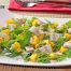 Sirve la ensalada de garbanzos con anguila, mango y aguacate en los platos, sobre una cama de rúcula, y corona con una pequeña porción de anguila ahumada cubierta con las huevas de arenque ahumado, termina espolvoreando un poco de ñora molida y aderezando con la vinagreta de pistachos.
