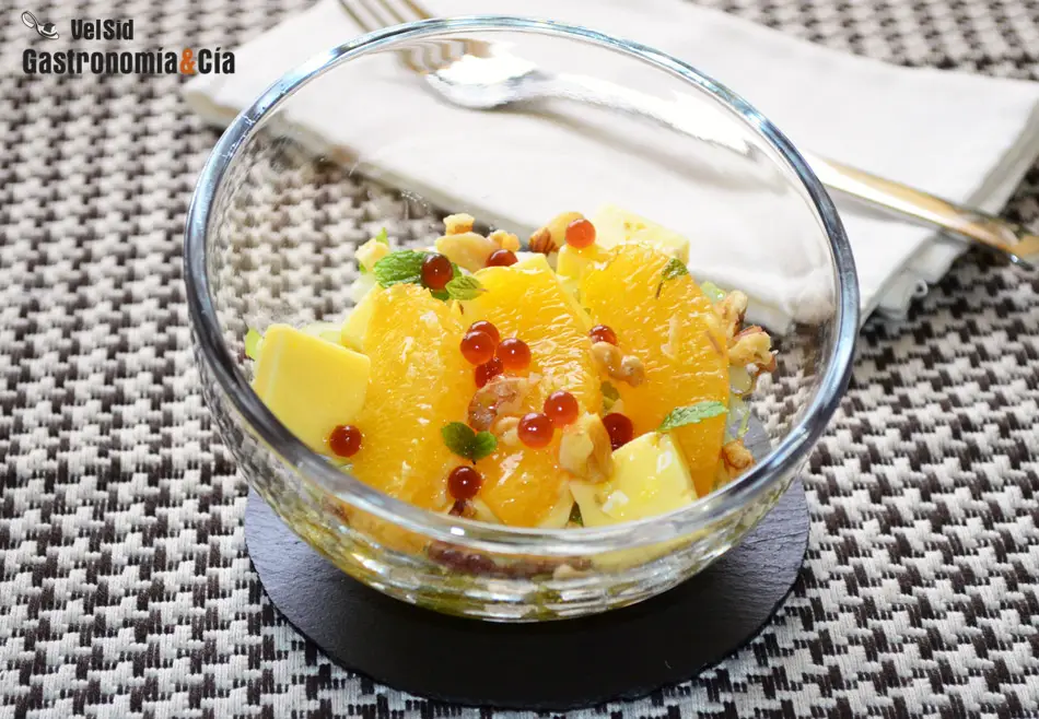 Os proponemos una ensalada para servir en una comida festiva, de la que podéis preparar una pequeña ración para abrir boca. La Ensalada de naranja con queso Gouda y nueces es un entrante refrescante y con mucho sabor, con un juego de texturas que resulta muy agradable. Sobra decir que es una receta muy fácil de hacer y que necesita poco tiempo de dedicación en la cocina.