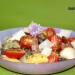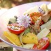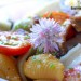 Sirve la pasta al dente en los platos y ve incorporando el resto de ingredientes, reparte las setas de cardo, los tomates, el queso parmesano y finalmente, adereza con la dukkah, el cebollino y un buen chorro de aceite de oliva virgen extra. Termina decorando con una flor de cebollino, ahora están en su momento y otorgan un toque elegante de sabor además de visual.