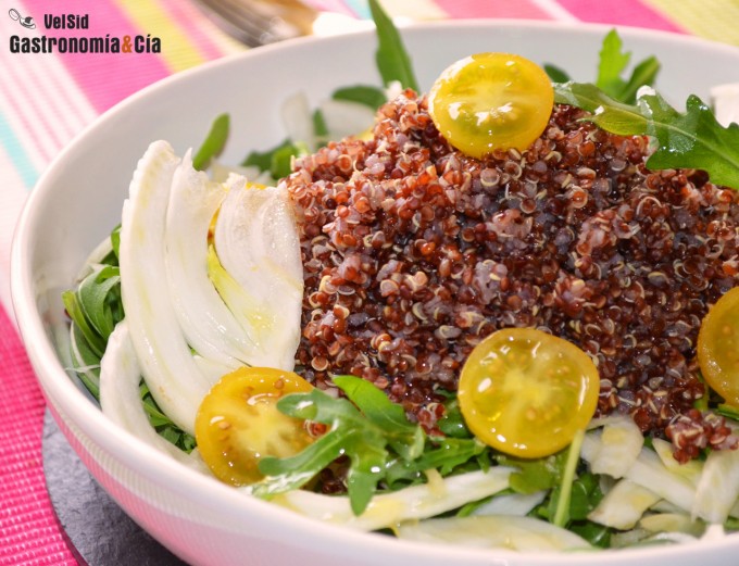 Cuando pruebas la quinua es fácil que se convierta en uno de los productos básicos de la cesta de la compra, nosotros hace años que la consumimos, aunque hasta no hace mucho tiempo sólo podíamos acceder a la quinua blanca. Ahora es más conocida y llegan también otras variedades a nuestro país, y la roja nos encanta por su sabor, por sus propiedades y por su aspecto, hace apetecible cualquier plato, por muy sencillo que sea, como esta Ensalada de quinua roja, hinojo y tomates cherry.