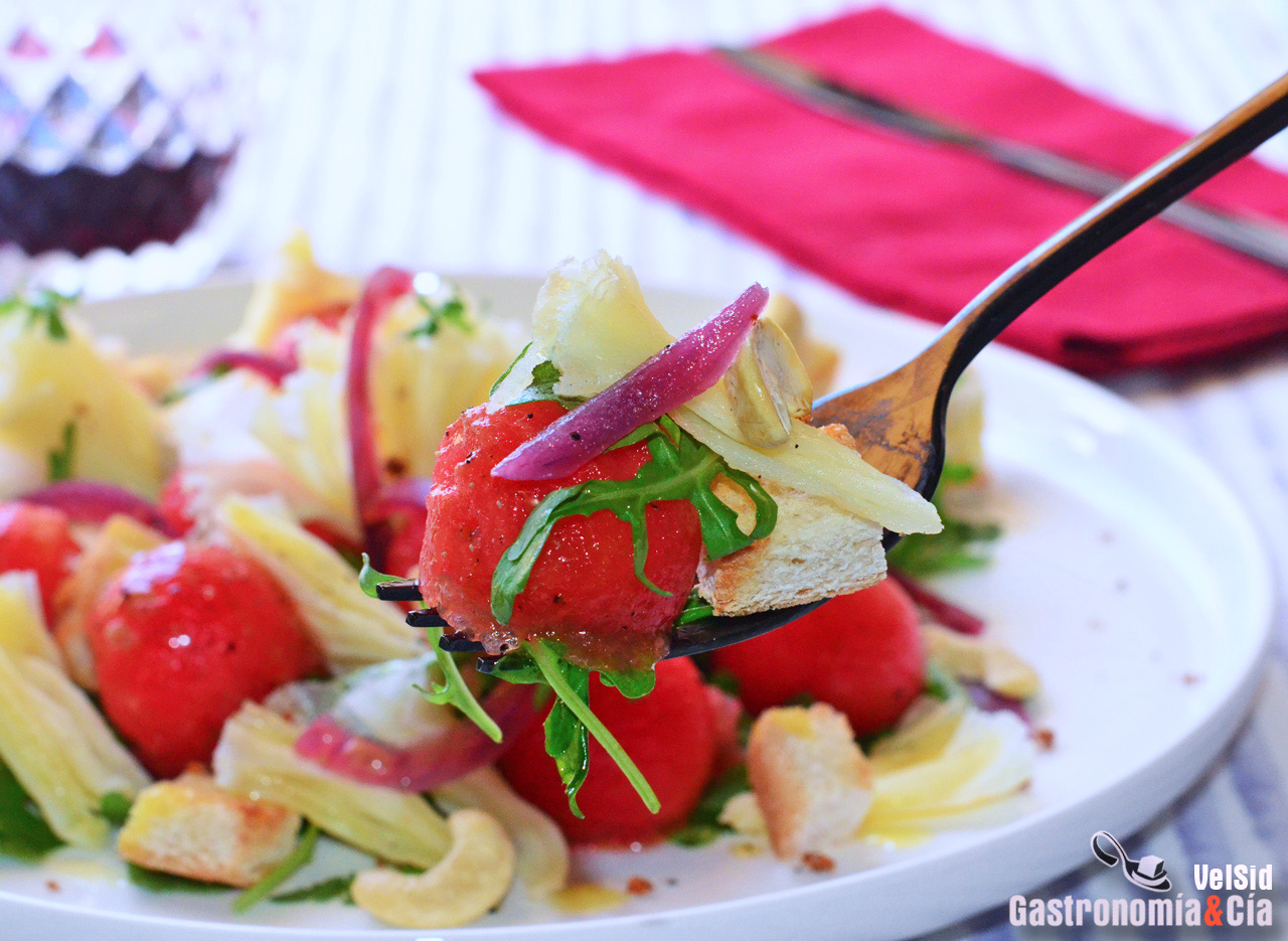Esta ensalada de rúcula, higos y Tête de Moine puede recordar a la panzanella porque lleva unos daditos de pan que tostamos muy ligeramente, dándole la posibilidad de que absorba bien la vinagreta de mostaza y miel con la que la aderezamos. Elegimos un pan integral con semillas porque nos parece súper sabroso e ideal para acompañar tanto el queso como los higos. Al final es un plato sencillo, pero se convierte en un entrante delicioso y nutritivo, original y muy fácil de hacer, sólo debemos añadir que después de hacer las fotos pusimos más queso a la ensalada porque está increíble y lo queríamos encontrar en cada bocado.