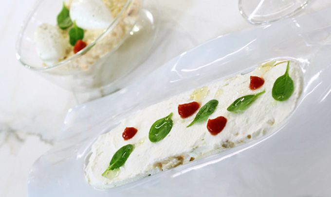 Colocamos la ensalada de centollo en un plato un poco hondo y sobre ella servimos una capa fina de la crema cítrica, unos brotes de espinaca, unas gotas de tomate frito y un hilo fino de aceite de oliva virgen extra.